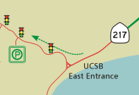 the east entrance to UCSB. The speed limit drops from 65 to 25 mph.
