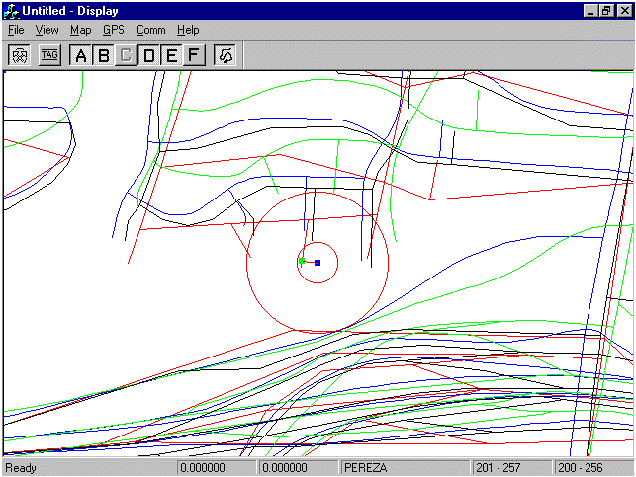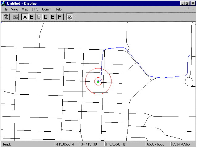 test vehicle (blue). Display is centered on current GPS coordinate